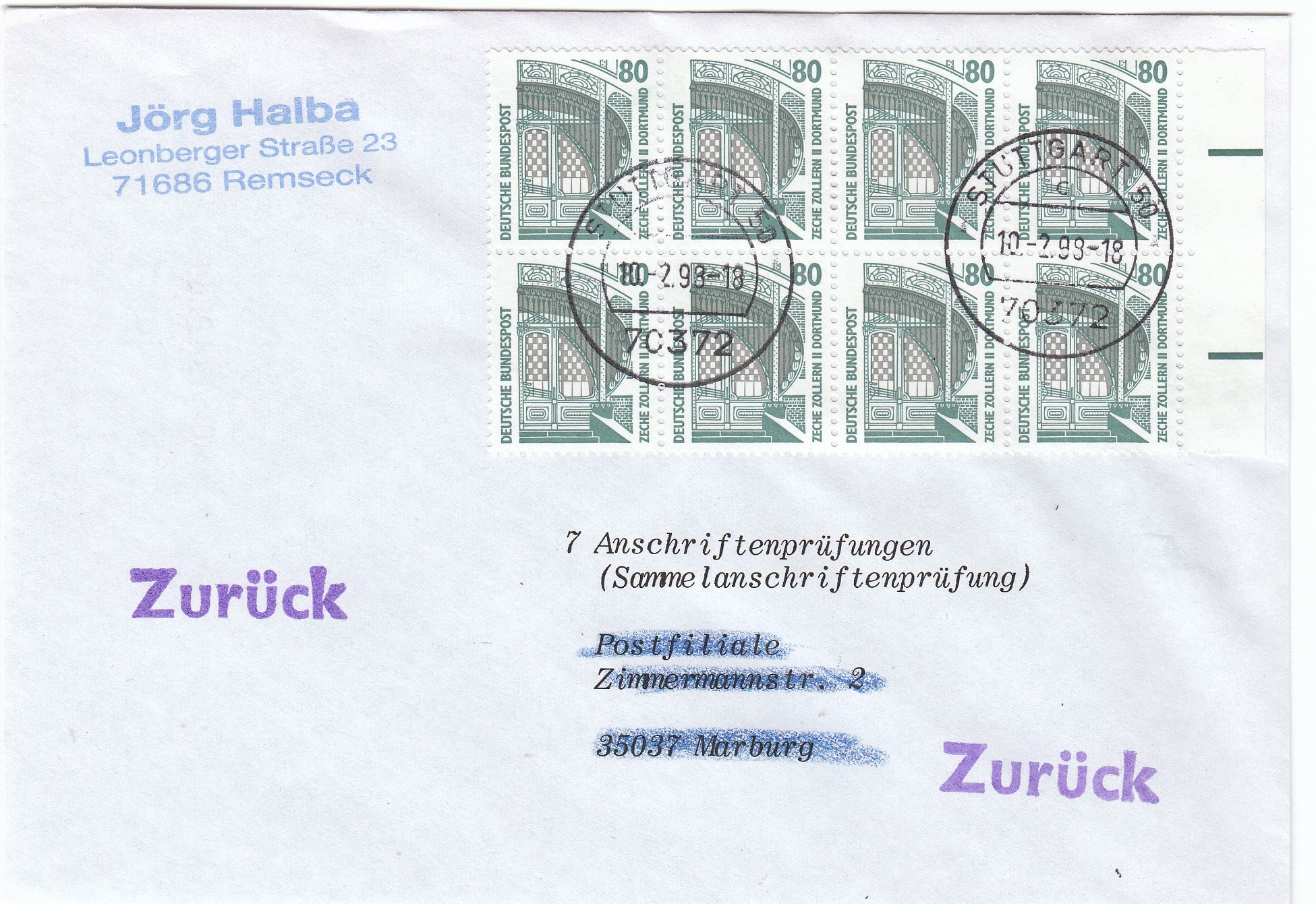 Die Entwertung erfolgte am 10.2.98 in 70372 STUTTGART 80, die Sendung ging nach Marburg und nach Erledigung "Zurück" an den Absender in Remseck.