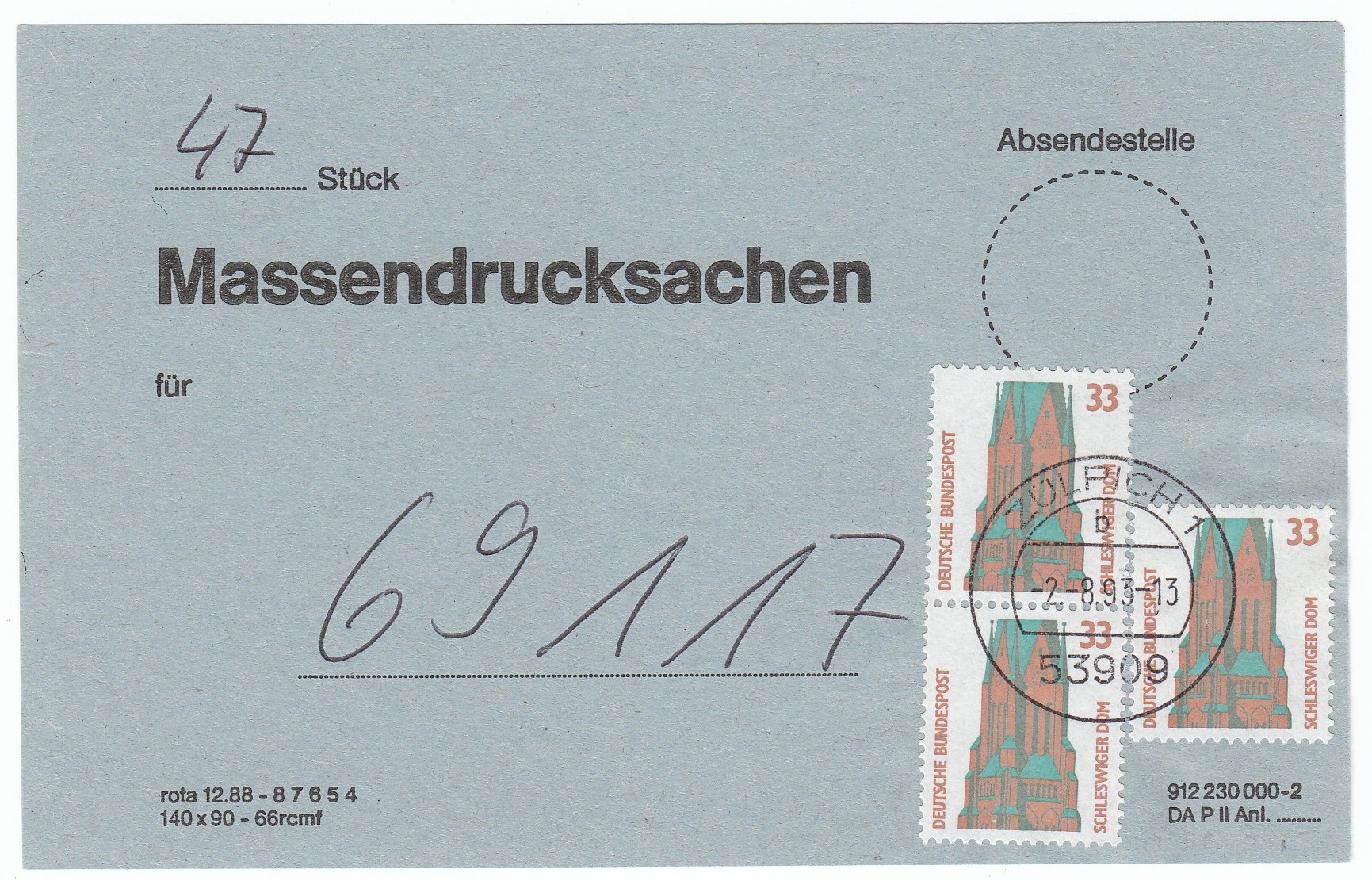 Das Porto für die 3 "fehlenden" Massendrucksachen, dreimal 33 Pf, wurde hier auf dem Kennzeichnungszettel verklebt und am 2.8.93 in 53909 ZÜLPICH 1 entwertet.