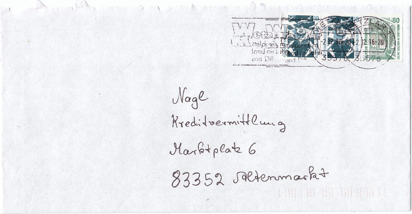 Standardbrief, Postgebühr 100 Pf, mit drei Werten SWK selbstklebend aus Markenheftchen, entwertet am 2.12.96 per Maschinenstempel in 35576 WETZLAR 1.