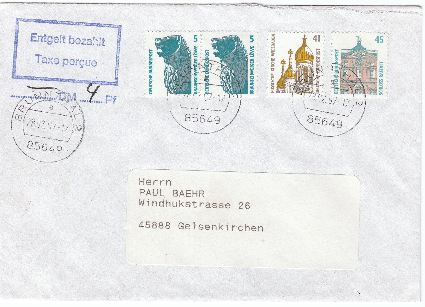 Standardbrief, Postgebühr 100 Pf, freigemacht als MiF mit 4 Werten SWK sowie Stempel "Entgelt bezahlt / Taxe percue/ .....DM ..... Pf" mit handschriftlichem Eintrag der Wertstufe "4 (Pf)", entwertet am 28.02.97 in 85649 BRUNNTHAL 2.