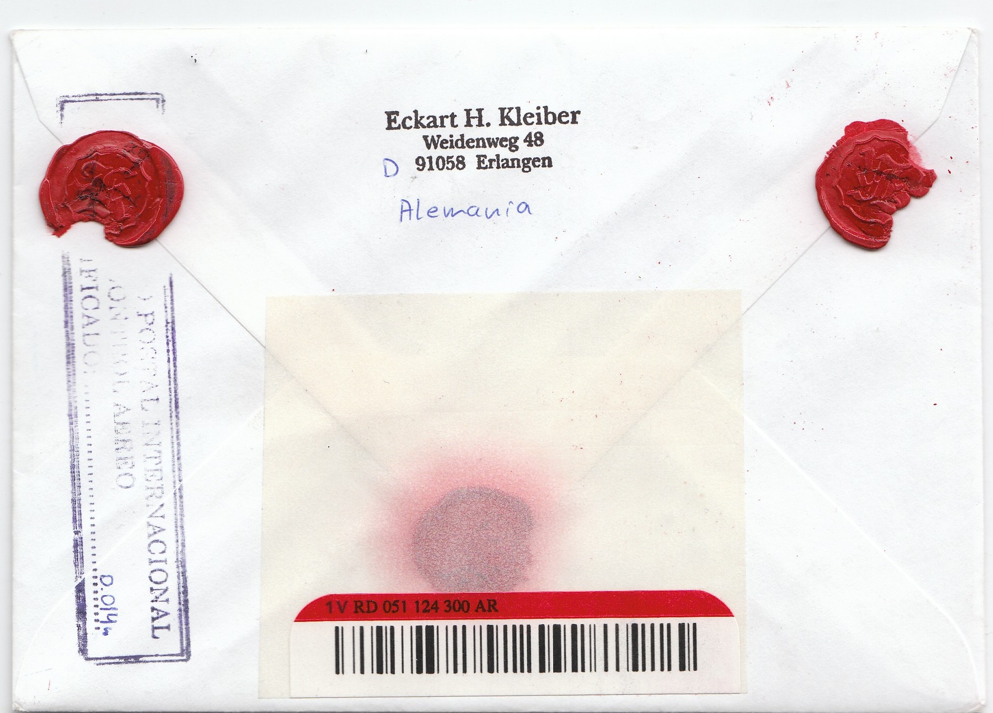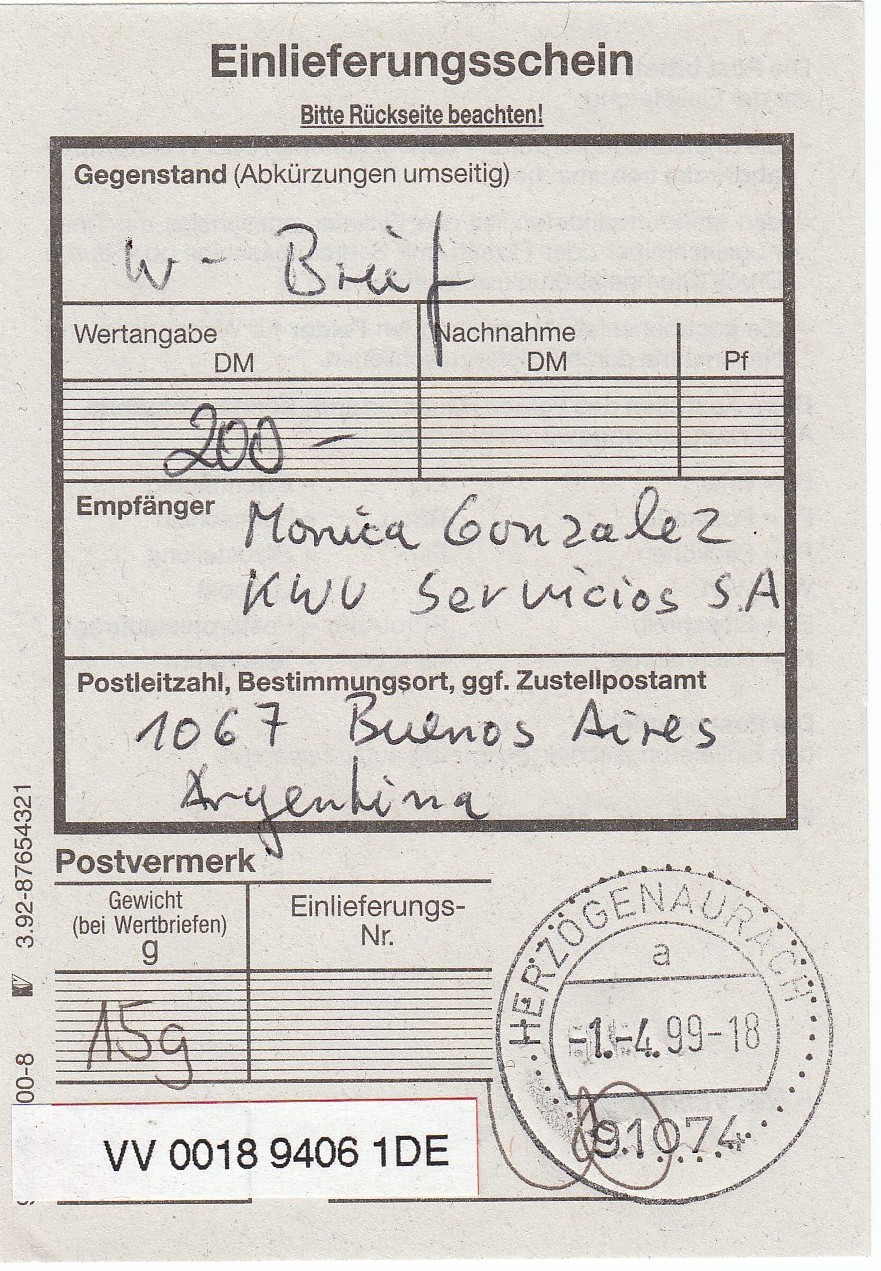 In Argentinien angekommen erhielt der Beleg einen selbstklebenden R-Zettel der argentinischen Post sowie rückseitig das dazugehörige Barcodelabel!