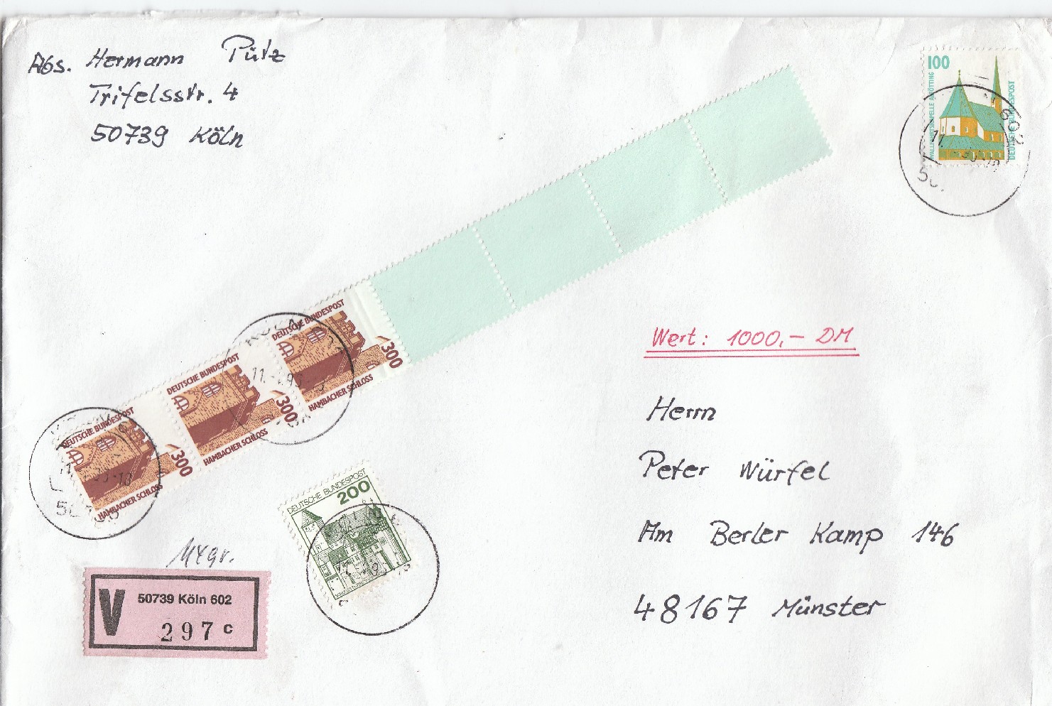 Brief von 51 bis 500 g, hier "114 gr" schwer, Postgebühr 300 Pf, mit Wertangabe "1000.- DM", Behandlungsgebühr 900 Pf, ergibt die Portostufe 1200 Pf, hier freigemacht als MiF SWK/B&S, dabei ein Dreierstreifen des 300 Pf Wertes SWK vom Rollenende, entwertet am 11.4.95.