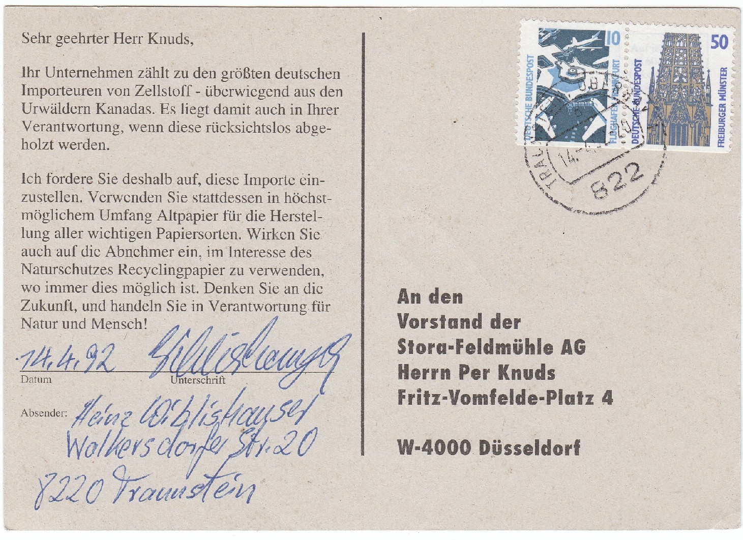 Das Ganze als Aufruf an den Vorstand der Stora-Feldmühle AG, statt Zellstoff zu importieren Altpapier zur Papierherstellung einzusetzen.