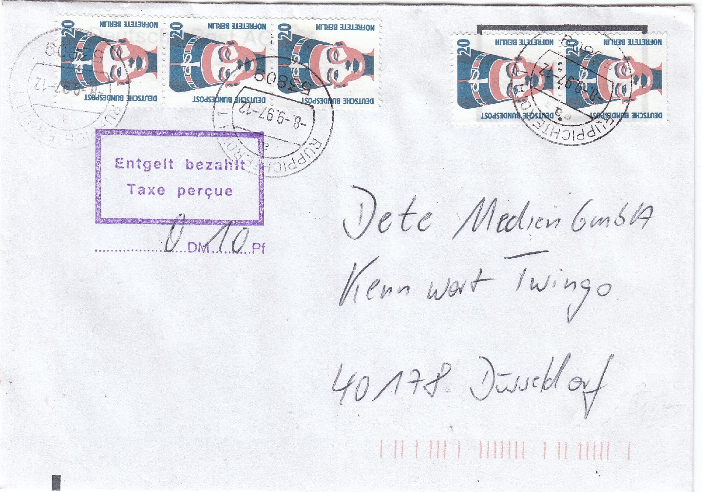Der Brief wurde linearcodiert, wobei ein Teil der Codierung auf den beiden unten verklebten Postwertzeichen landete.