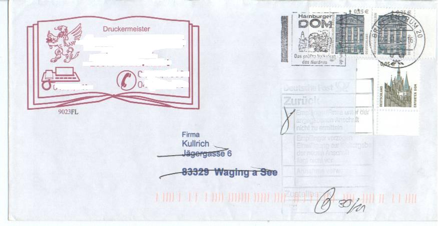 Den Anfang macht ein Geschäftsbrief mit einem waagerechten Paar der 5 ct Marke, links der Plattenfehler. Dazu zur Portorichtigkeit eine linke untere Bogenecke des Wertes zu 45 ct. Stempel Briefzentrum 20 vom 26.12.04