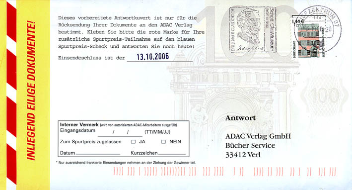 entwertet mit MaSt BRIEFZENTRUM 07 ma vom 12.10.06 Werbezusatz "Schott Glasmuseum.." codiert