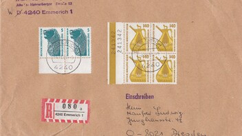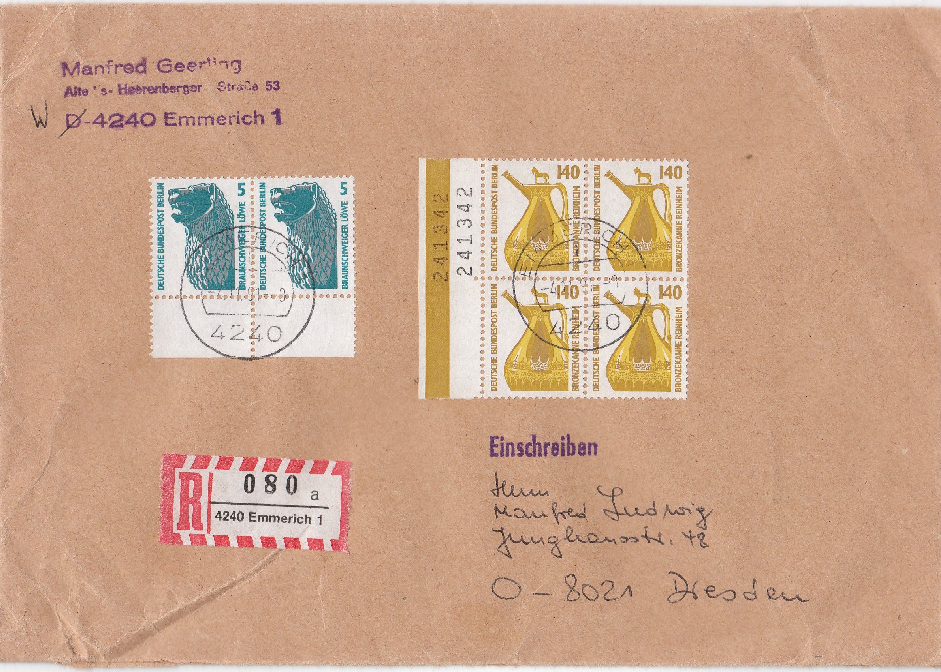 Brief von 101 - 250 g, 320 Pf, per Einschreiben, 250 Pf, ergibt die Portostufe 570 Pf, hier am 4.11.91 im VGW freigemacht per Viererblock des 140 Pf Wertes SWK, Ausgabe Berlin, mit links anhängendem Bogenrand mit doppelter Bogenzählnummer, in Kombination mit einem Paar des 5 Pf Wertes SWK, Ausgabe Berlin, vom Unterrand, gelaufen ins VGO.
