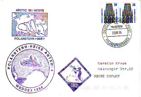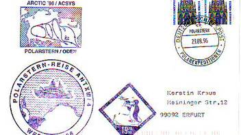 Mi Nr. 1340 als Waagerechtes Pärchen, hier sogar noch mit einem Werberstempel der Polarexpedition von 1996 (Wedde)