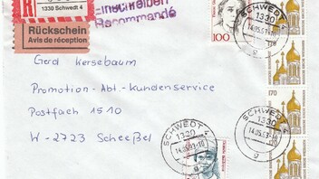 Standardbrief, 100 Pf, per Einschreiben, 350 Pf, mit Rückschein, 350 Pf, ergibt am 14.05.93 die Portostufe 800 Pf, hier dargestellt per Bedarfsbrief ab 1330 Schwedt 4 im VGO, gelaufen nach W-2723 Scheeßel im VGW, als MiF von vier Werten zu 170 Pf SWK sowie Frauen 100 Pf und 20 Pf.