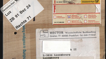 Den nachfolgenden "Beleg" habe ich heute aus einer Krabbelkiste in Nettetal-Breyell gezogen. Es handelt sich um ein "Begleit"-Holz-Stück mit Loch (als Anhänger?) zu einer "Sendung zu ermäßigtem Entgelt" als Übergabeeinschreiben, gelaufen nach Luxemburg, frankiert mit diversen Werten der SWK-Serie und entwertet in Frankfurt/ Main mit Datum vom 07.09.2000. Bei dem Absender handelt es sich um eine Buchhandlung aus Frankfurt, bei dem Empfänger um ein Unternehmen aus Luxemburg (Stadt).