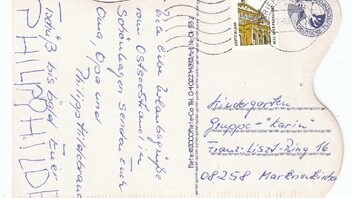 Diese Postkarte wurde wegen ihrer eigenwilligen Form als solche nicht anerkannt und mußte als Brief mit 0,55 € freigemacht werden.