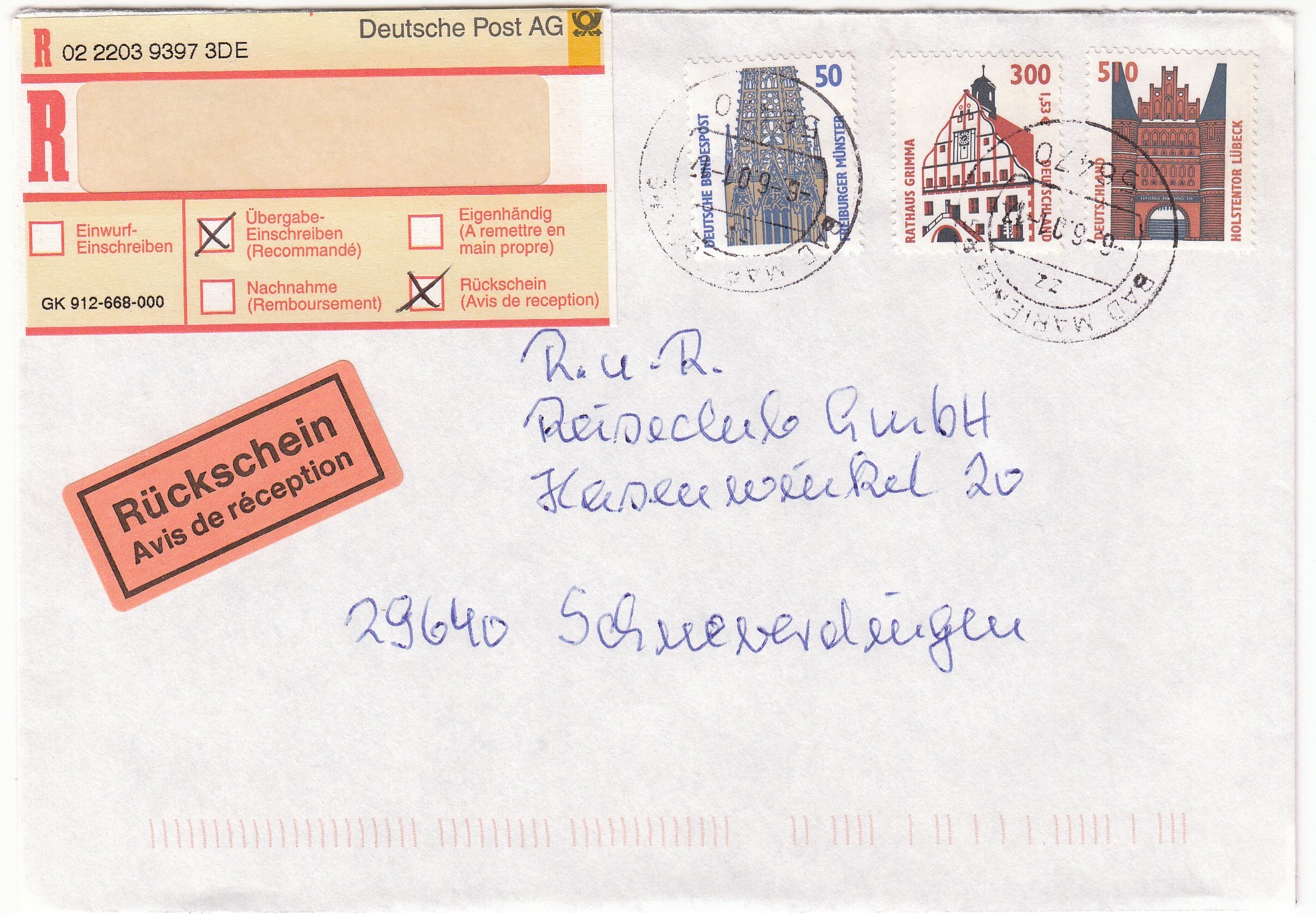 Zur Abdeckung der Portostufe 860 Pf für einen Standardbrief, Postgebühr 110 Pf, per Einschreiben, Postgebühr 400 Pf mit Rückschein, Postgebühr 350 Pf.