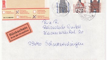 Um gegenüber Kunden nachweisen zu können, dass eine (nicht eingeschriebene) Büchersendung ordnungsgemäß an jenen abgegangen ist, bereitet lebenslauf solche Quittungszettel vor (Adressat von mir unkenntlich gemacht), und klebt eine niedrigstufige Marke darauf; der Schalterbeamte "muss" diese Marke dann zusammen mit der eigentlichen Büchersendung entwerten, und schon sind Ort, Datum und Uhrzeit dokumentiert!
