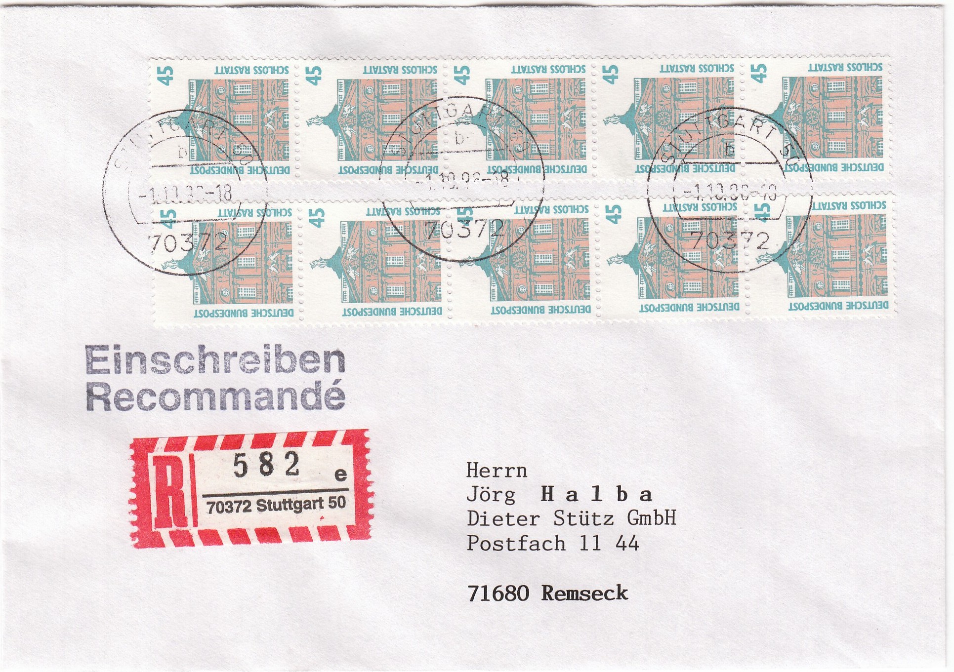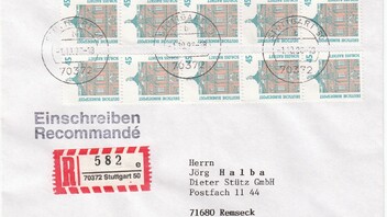 Mehrfachfrankatur von 10 Marken des 45 Pf Wertes portogerecht zur Abdeckung der Portostufe 450 Pf eines Standardbriefes, Postgebühr 100 Pf, per Einschreiben, Postgebühr 350 Pf.