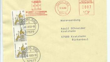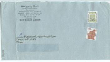 Eine Postzustellungsauftrag von einem Obergerichtsvollzieher, frankiert mit einer Marke SWK zu 700 und einer zu 400 Pf, zusammen also portorichtige 11,--DM. Abgestempelt ist das Stück in 31840 Hessisch-Oldendorf am 26.7.99-18