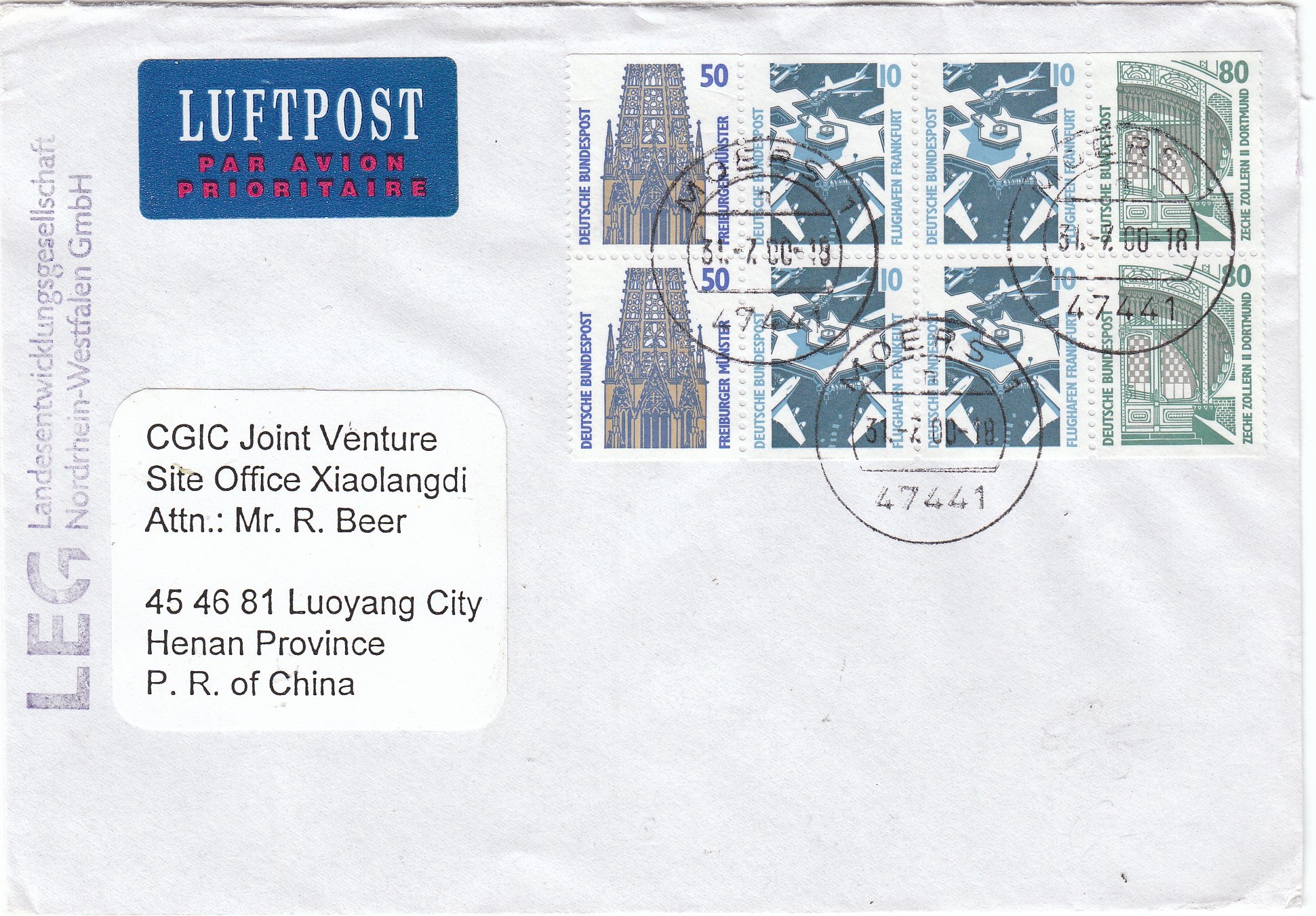 Brief (Welt) Luftpost, Postgebühr 300 Pf, portogerecht frankiert mit einem Heftchenblatt Michelnummer 30, entwertet am 31.7.00 in 47441 MOERS 1, echt gelaufen nach China mit rückseitigem Ankunftstempel 6.8.2000.
