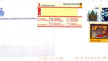 Und noch eine zu 220Pf/112ct aus der rechten oberen Ecke mit Stempel Altensteig vom 18.4.01. Diese 3 Belege habe ich auf einem grossen Grabbeltisch gefunden, Stückpreis 5 ct. Also Marken abweichen und ab damit in die Dauerseriensammlung :jaok: , billiger kann man da wohl nicht rankommen...