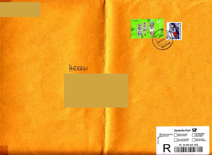 Einwurf- Einschreiben als MiF (oder irre ich mich ?(, falls ja, bitte korrigieren ;)) 0.45€ SM Europa Cept "Pfadfinder" plus 2,60€ SWK Freimarke "Seute Deern Bremerhaven", macht insgesamt 3,05€. (Setzt sich wie folgt zusammen: 1,45€ Großbrief bis 500g, 1,60€ Zusatzleistung Einwurf Einschreiben). Gestempelt am 28.01.2008 in 04158 Leipzig.