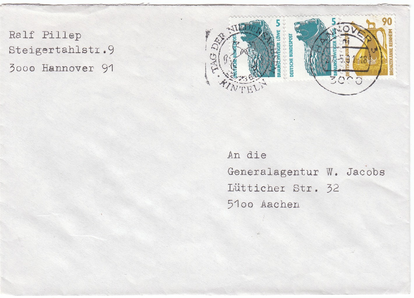 Hier ein Standardbrief vom 27.5.91, Postgebühr 100 Pf, als FaF portogerecht freigemacht mit einem 90 Pf Wert sowie zwei 5 Pf Werten.