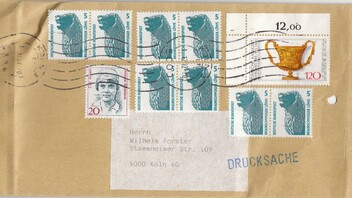 Drucksache von 101 bis 250 g, Postgebühr 180 Pf, als MiF frankiert mit vier Paaren des 5 Pf Wertes SWK, einem 20 Pf Wert Frauen sowie einer 120 Pf Sondermarke als Eckrandstück, entwertet per Handrollstempel am 1.12.92.