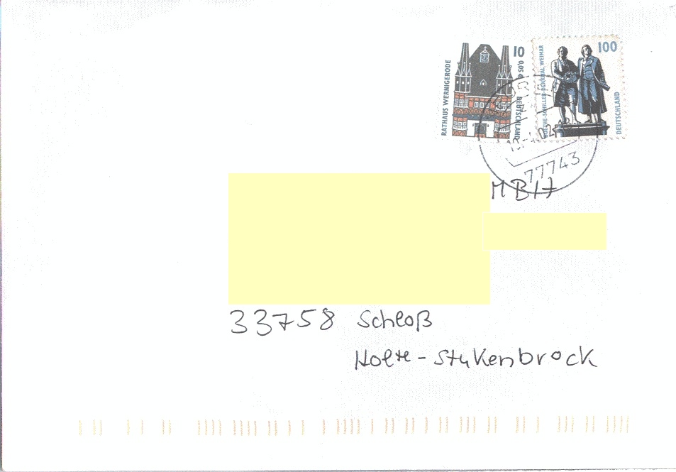 Standardbrief, 110 Pf, per Übergabeeinschreiben, 300 Pf, ergibt die Portostufe 410 Pf, hier am 9.11.1999 portogerecht freigemacht per MiF mit einem 200 Pf Wert SWK, einem 110 Pf Wert SWK unten ungezähnt aus Markenheftchen sowie einer 100 Pf Sondermarke zum 5. Jahrestag der Öffnung der innerdeutschen Grenzen. Die Entwertung erfolgte zum 10. Jahrestag per Sonderstempel passend zum Thema der Sondermarke.