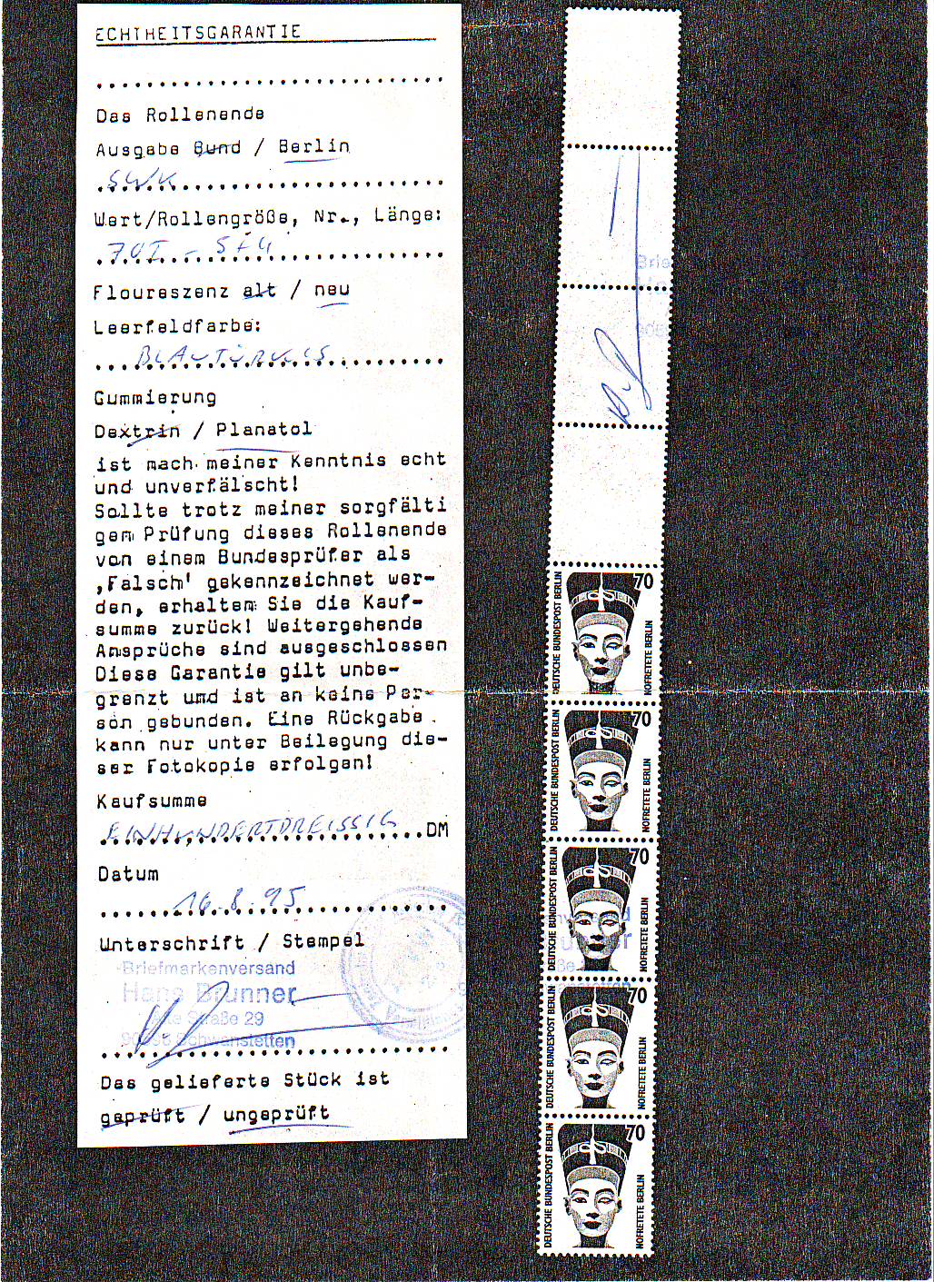 erstens ist der 20 Pf-Streifen nicht verzähnt sondern einfach nur schlecht vom Wertzeichengeber am Schalter abgerissen worden. Und zweitens kann die 20 Pf-Marke keine 4-stellige Nummer haben, die gab es nur in 500-er-Rollen ;) Schau mal genau nach, welche Nummer drauf ist ;)