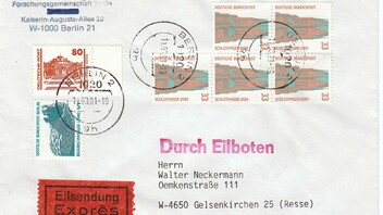 Kompaktbrief 2,20 DM + Einwurfeinschreiben 3,00 DM = 5,20 DM, frankiert mit 110/51-Doppelnominale und 400-DM-Nominale SWK, dazu als Ausgleichswert eine - irgendwie doch passende - 10 Pf Brandenburger Tor. Offensichtlich auch ein Fall von Aufbrauchen postfrischer Altbestände vor der Ungültigkeit.