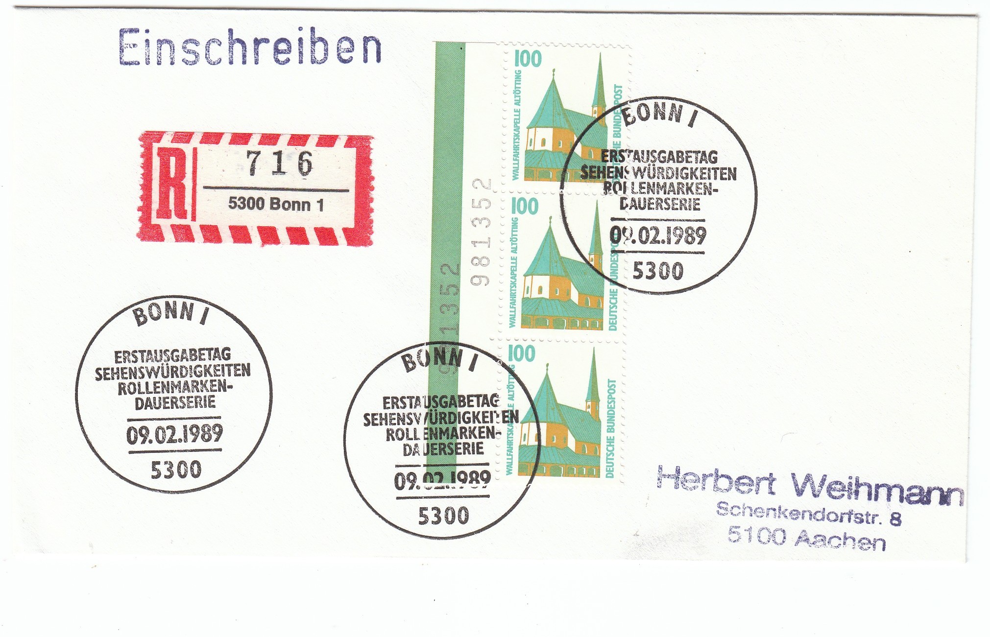 Hier ein Standardbrief, 80 Pf, per Einschreiben, 200 Pf, ergibt die Portostufe 280 Pf, am 09.02.1989 als Erstausgabetag frankiert mit einem senkrechten Dreierstreifen des 100 Pf Wertes SWK vom linken Bogenrand mit doppelter Bogenzählnummer und entwertet mit Ersttagsstempel!