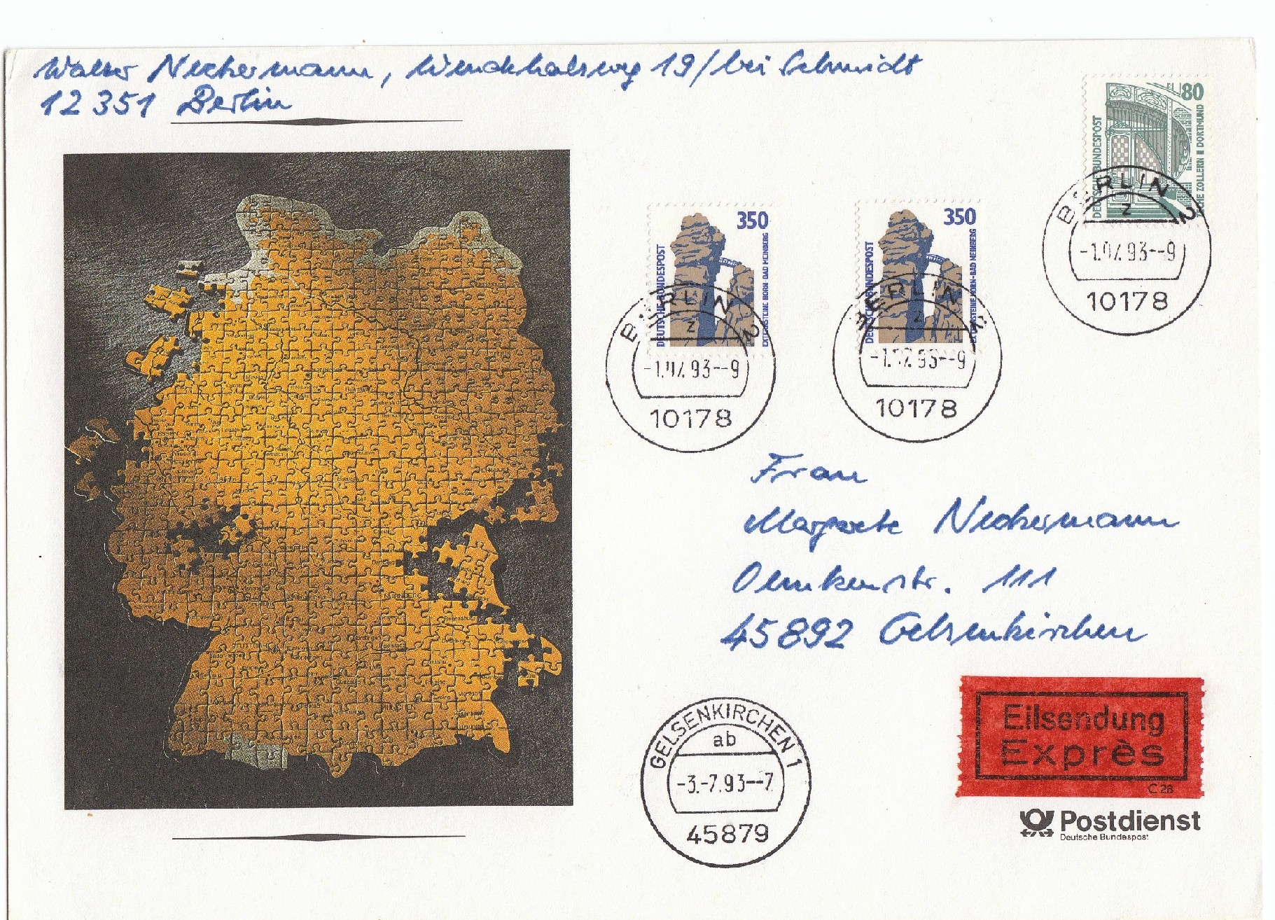 Postkarte, 80 Pf, per Eilzustellung 06 - 22 Uhr, 700 Pf, ergibt die Portostufe 780 Pf, hier am 1.07.93 um 9 Uhr in BERLIN 12 aufgegeben.