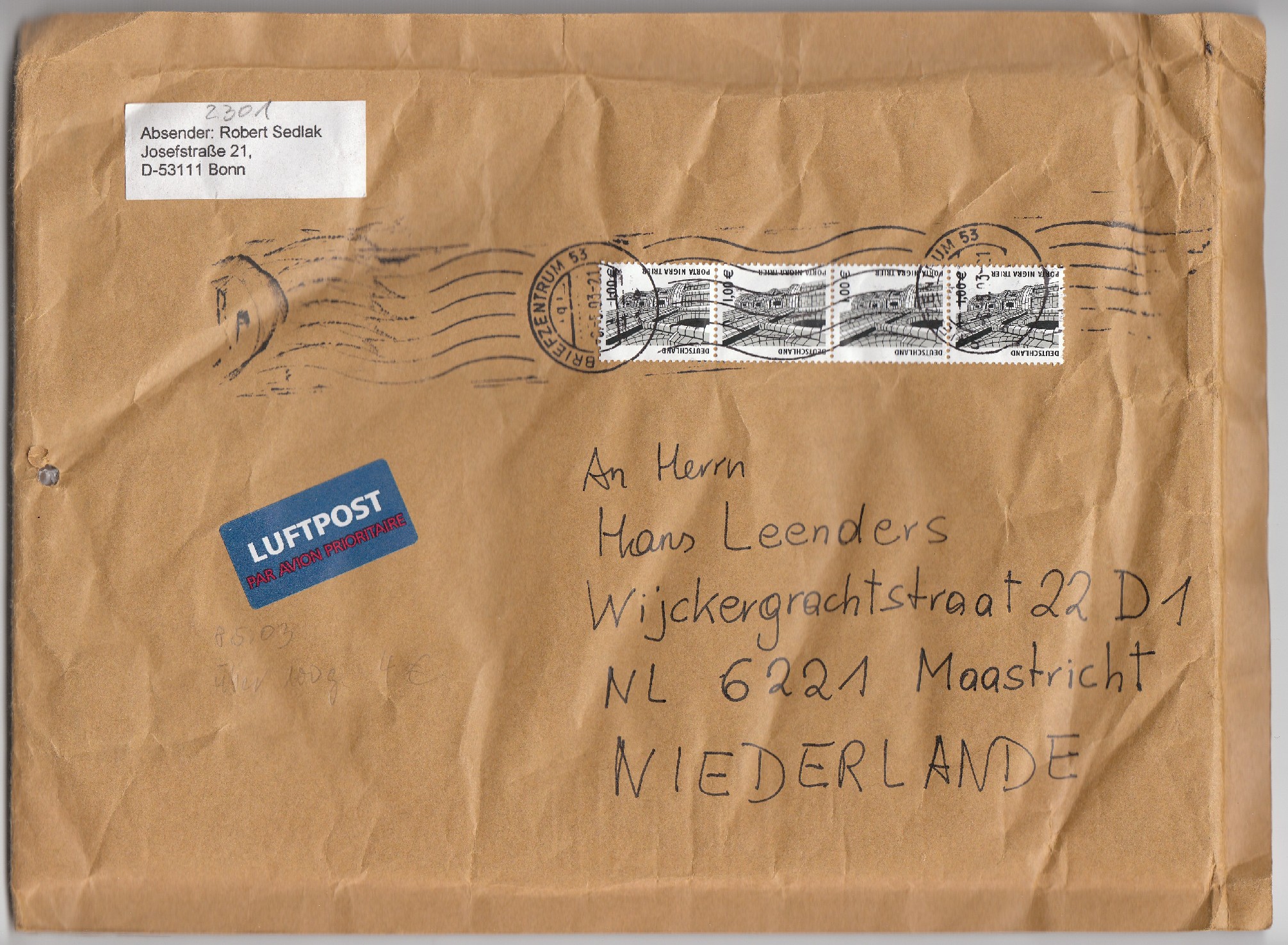 Die Entwertung erfolgte per Handrollstempel im BRIEFZENTRUM 87.