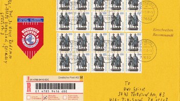 Die Freimachung erfolgte mit zwei Heftchenblättern Michelnummer 40, wobei das untere auf Feld 3 die Michelnummer 1934 I zeigt, also den Plattenfehler "länglicher Fleck am Rock von Goethe", der auf einer Teilauflage des Markenheftchens Michelnummer 36 auftritt!