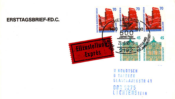 Maxibrief Welt (Luftpost) bis 50 g, Porto 600 Pf, per Übergabeeinschreiben, Porto 400 Pf sowie Einzustellung, Porto 1000 Pf, ergibt die Portostufe 2000 Pf.