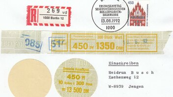 Der Brief wurde nicht etwa direkt am 13.08.1992 als Ersttag aufgegeben, sondern er wurde innerhalb der einmonatigen Nachfrist zur Erfüllung von Ersttagsstempelwünschen beim Postamt 1000 BERLIN 12 aufgegeben.