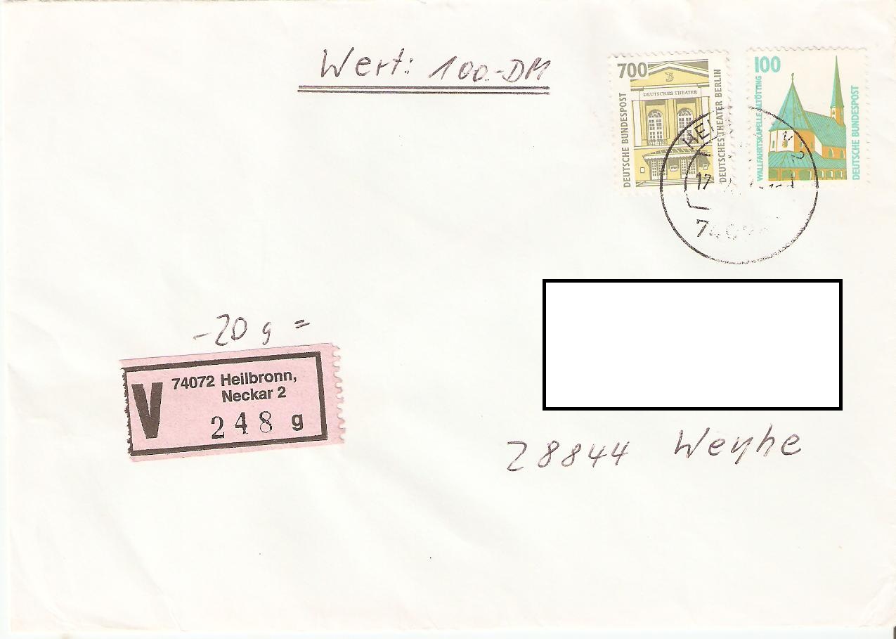 Dein Brief vom 27.08.1990 ist portogerecht als Standardbrief, Porto 50 Pf, per Einschreiben, Porto 150 Pf. Dieser Sondertarif galt von 01.07.1990 bis 31.03.1991 ab VGO!