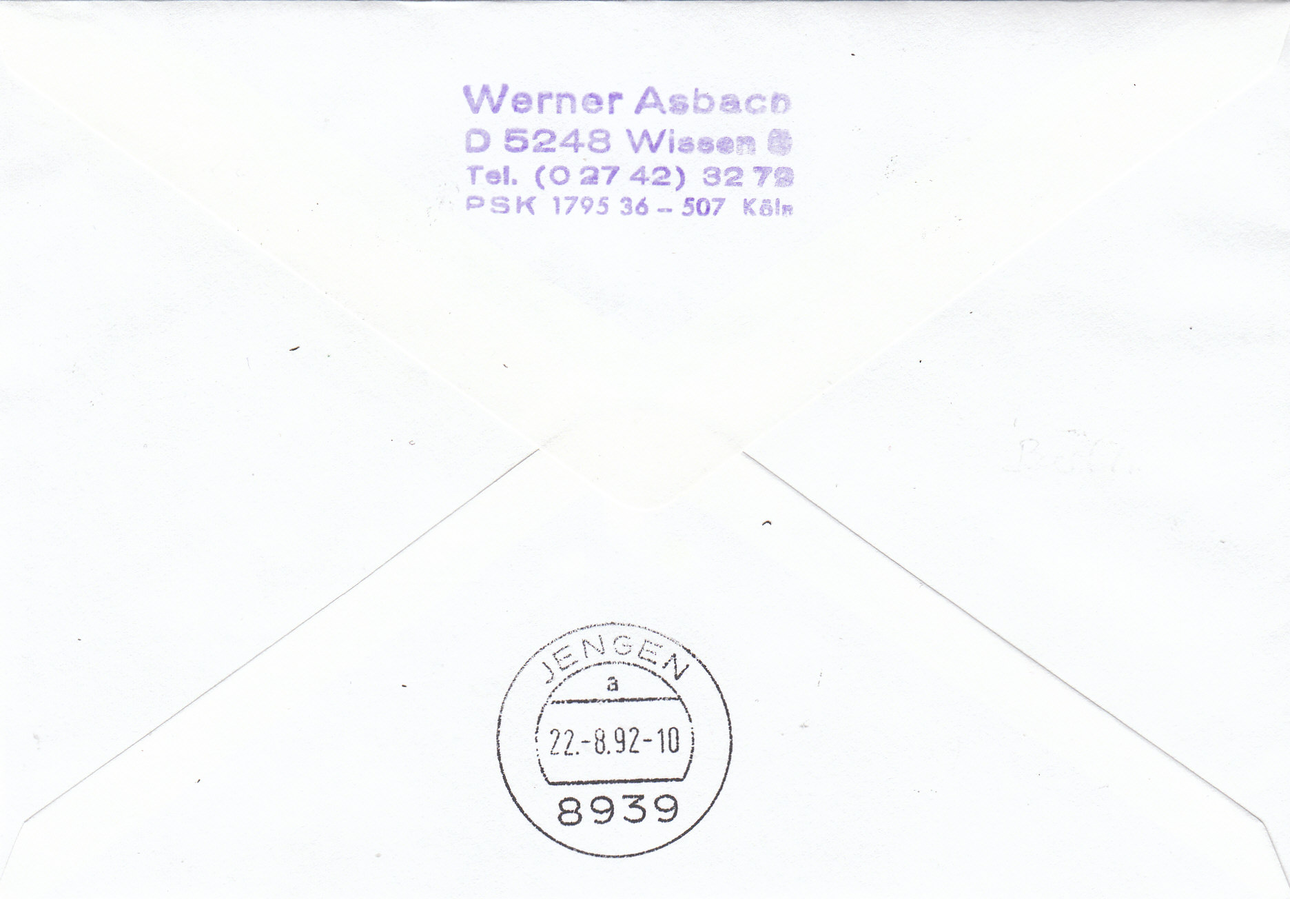 Am 22.8.92 kam der Beleg dann am Enpfangsort JENGEN an, wie der rückseitige TSt dokumentiert.