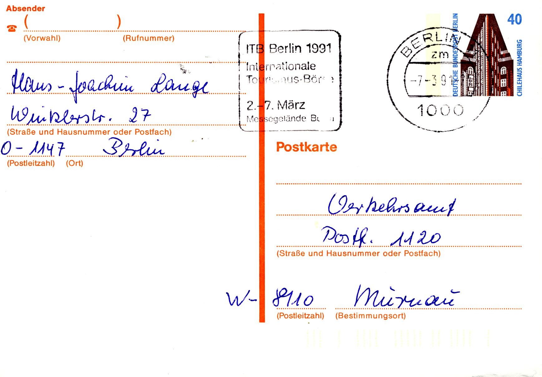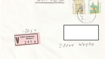 Dein Brief vom 27.08.1990 ist portogerecht als Standardbrief, Porto 50 Pf, per Einschreiben, Porto 150 Pf. Dieser Sondertarif galt von 01.07.1990 bis 31.03.1991 ab VGO!