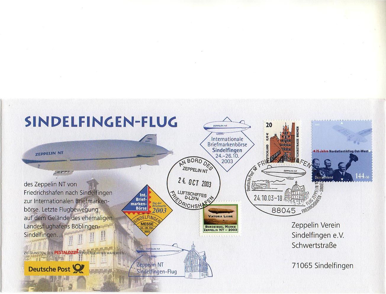 Hier ein "Zeppelin-Beleg" v. 24.10.2003 Friedrichshafen - Messe Sindelfingen mit einem Exemplar der Mi.Nr. 2224.
