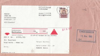 EF des 500 Pf Wertes am 14.11.95 portogerecht auf Brief von 21 bis 50 g, Porto 200 Pf, per Nachnahme, Porto 300 Pf, bedarfsgerecht von einem Gerichtsvollzieher "in Sachen"!