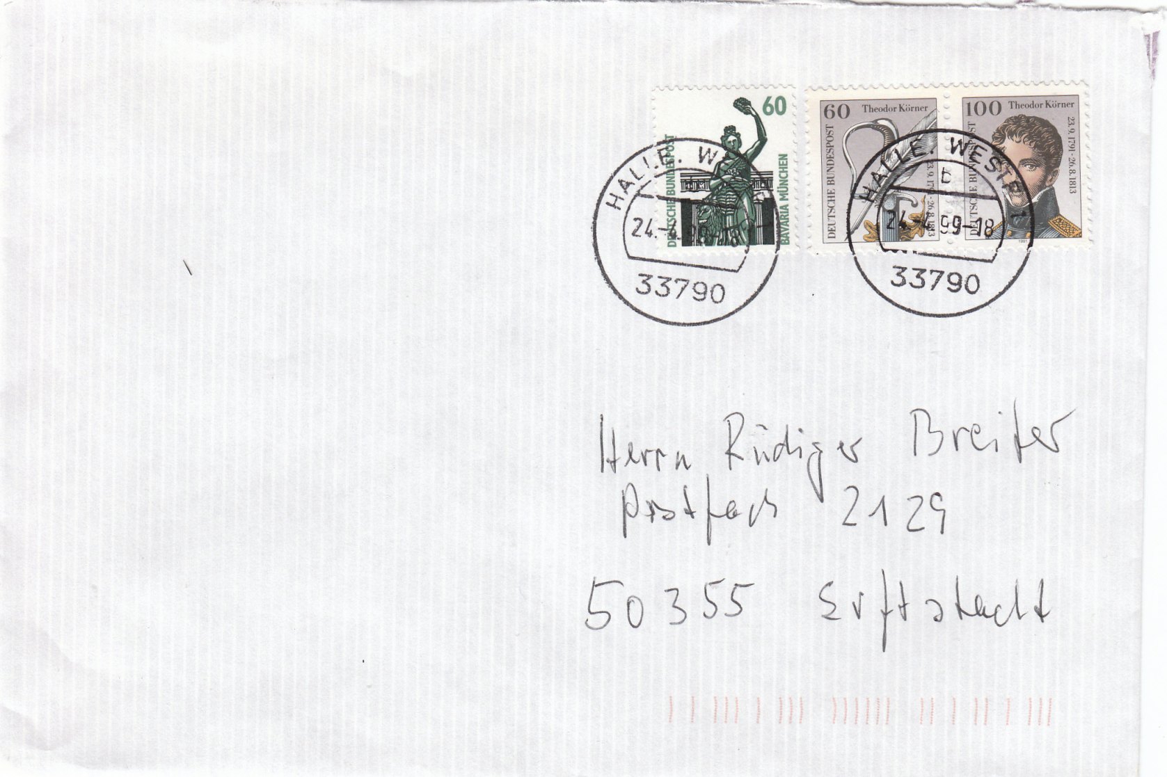 Das gute Stück wurde mit 170 Pf als Brief der zweiten Gewichtsstufe von 21 bis 50 g am 12.9.91 portogerecht frankiert.
