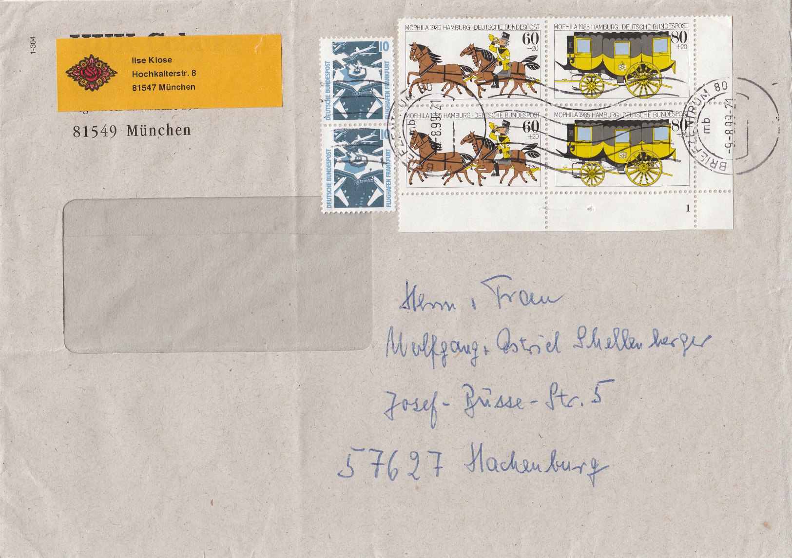 Brief von 21 bis 50 g, Porto 130 Pf, portogerecht frankiert am 6.10.88 als MiF mit je einem 80 Pf Wert SWK sowie einem 50 Pf Wert SWK.