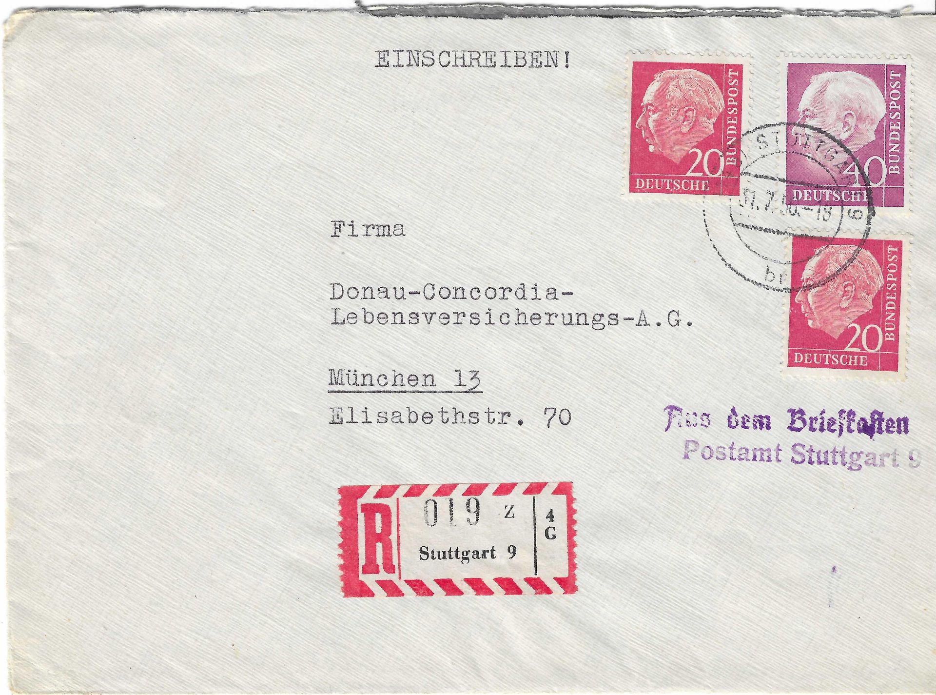 Der Brief wurde nicht am Schalter abgegeben, sondern in einen Briefkasten geworfen. Im Postamt Stuttgart 9 erkannte man den Brief als Einschreiben. Er erhielt dort seinen Einschreibzettel und zusätzlich den gestempelten Vermerk "Aus dem Briefkasten". Der Brief ist um 10 Pfg. überfrankiert.