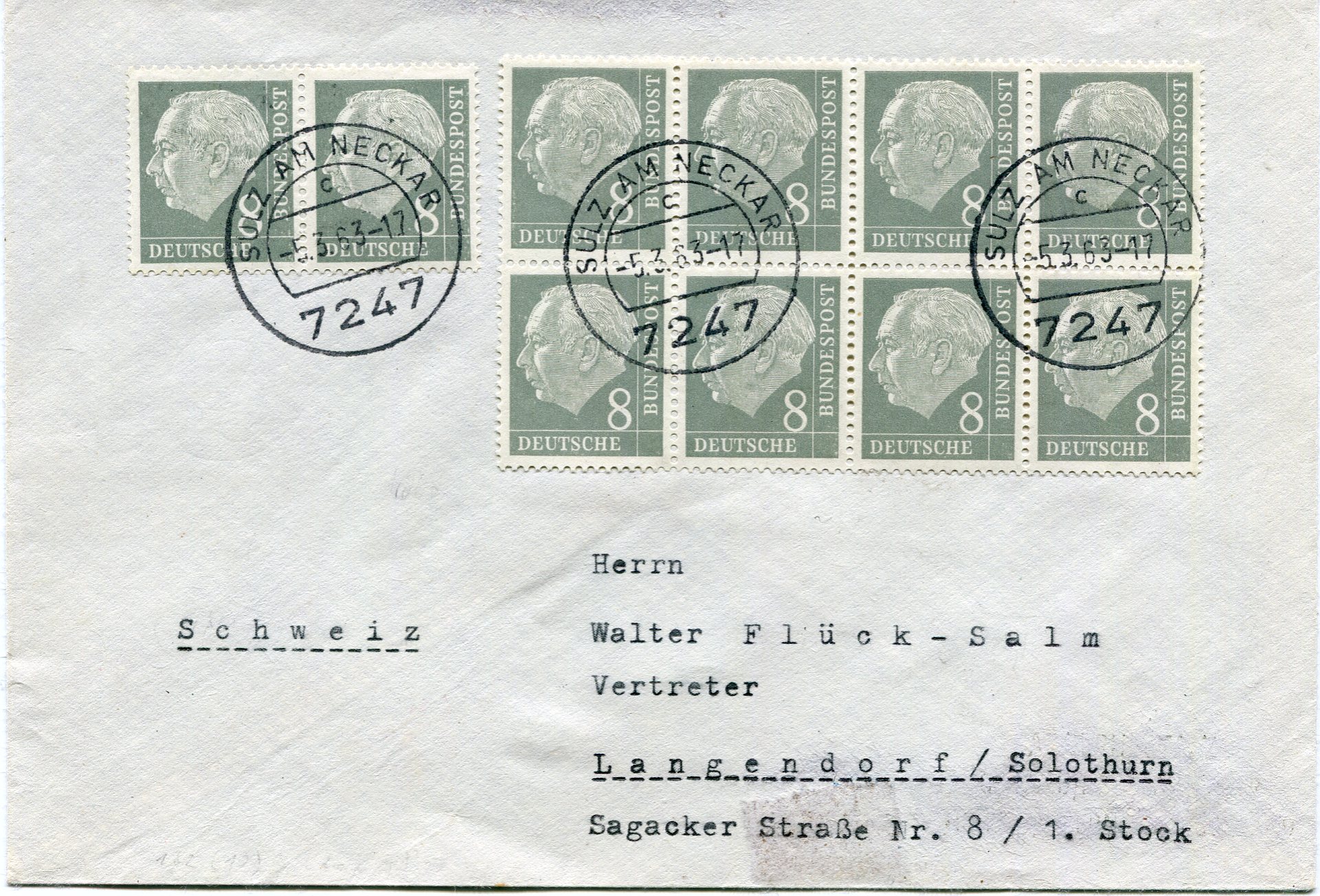 Brief der 3. Gewichtsstufe (40-80g) vom 5.3.63 von Sulz am Neckar nach Langenfeld in der Schweiz.