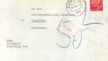 von mir ein etwas ungewöhnlicher Beleg aus meiner Heimatsammlung Elmshorn vom 14.11.65. Mit einer 20 Pfg. Heuss I Marke als Fernbrief frankiert und an die Polizeiabteilung in Elmshorn adressiert.
