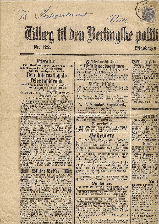 Hier eine Beilage zur Ausgabe vom Montag, den 29. Mai 1876. Portorichtig mit einer 4 Øre Marke der Tofarvede Ausgabe 1875 frankiert.
