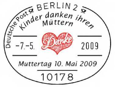 Am 07. Mai 2009 werden für den Muttertag 2009 (10. Mai) die hiernach aufgeführten Stempel eingesetzt. Das Besondere an dieser Aktion ist, dass das mittig eingepasste Herz real in der Farbe ROT gehalten ist. Die Stempel werden vor Ort (Philatelie-Shops, Postfiliale) als auch in der regional für den Ort zuständigen Stempelstelle eingesetzt. Vor Ort werden KEINE schriftlichen Stempelungsaufträge bearbeitet, sondern nur persönlich vorgetragene Wünsche realisiert. Hinweise: - Die Datierung der Stempel auf den 7. Mai ist erforderlich, damit Sendungen für den Muttertag (spätester Zugang beim Empfänger: 9. Mai) noch rechtzeitig versendet und korrekt abgestempelt werden können. - Die Stempel dürfen in den Filialen bis 11.5.09 verwendet werden. - Bei Verwendung unterschiedlicher Stempel auf echt laufenden Sendungen müssen Ortsangabe und Datumsfeld übereinstimmen. - Es wird empfohlen, den Umschlag mit dem schriftlichen Auftrag an die Stempelstelle deutlich mit „Muttertagsaktion“ zu kennzeichnen. Diese Aufträge werden den anderen Stempelungen vorgezogen. Dieses Vorziehen gilt aber ausschließlich für „Muttertags-Belege“. Zudem müssen die zu stempelnden Belege für die Muttertagsaktion ca. 14 Tage VOR dem Stempeldatum bei den Stempelstellen vorliegen, um eine rechtzeitige Bearbeitung und somit Versendung bestmöglichst zu gewährleisten. Gewähr hierfür kann jedoch nicht übernommen werden.