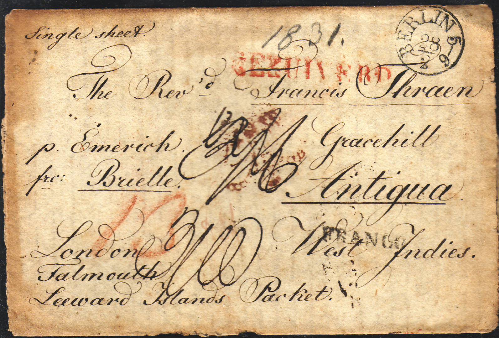 irgendwann hat man dann doch noch die überfahrt geschafft, so dass hinten das f.p.o., also foreign - post - office, auslandspostbüro, den eingang am 16.3.1832 bestätigen konnte.