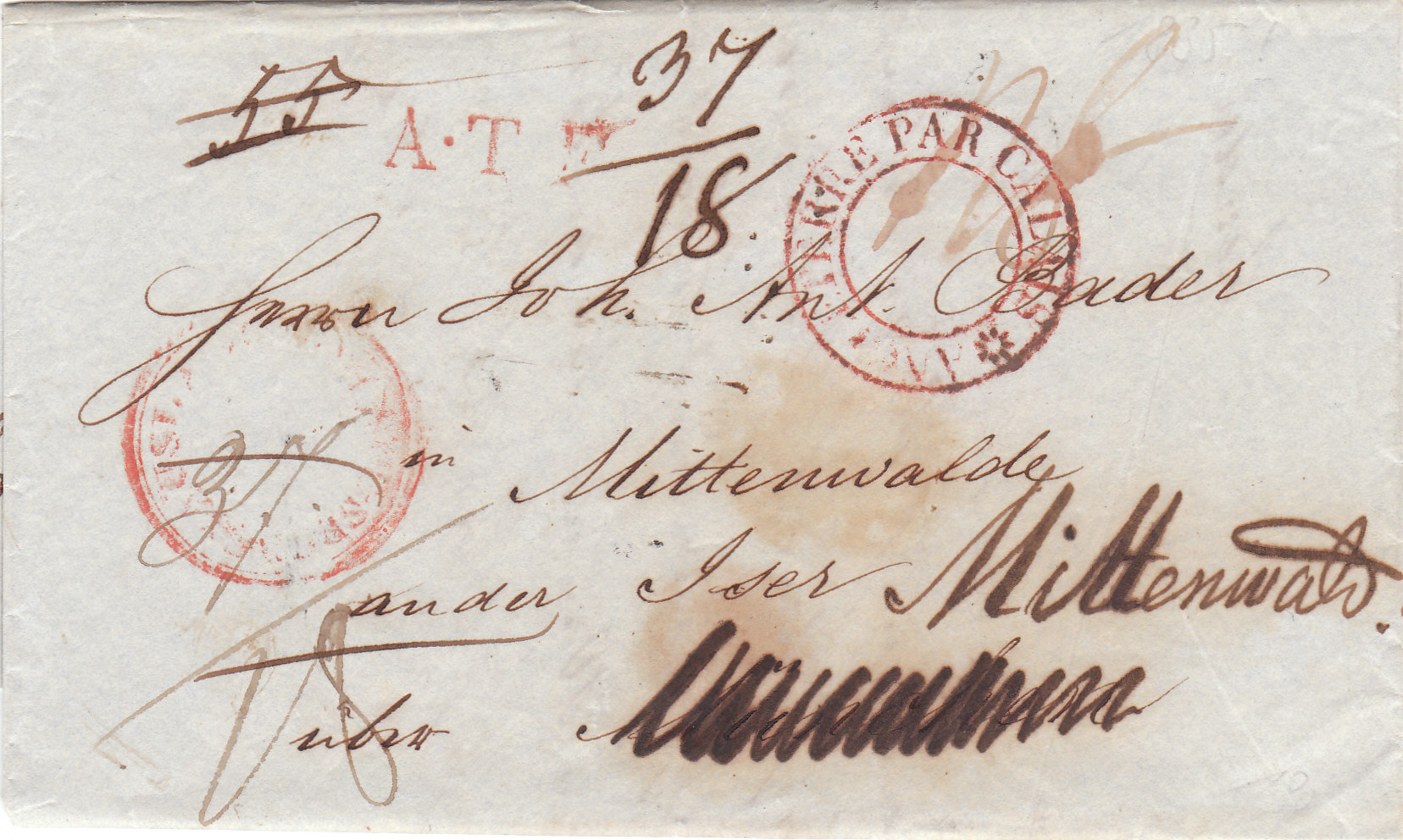 Der Brief ist 22. August von Boulogne-Sur-Mer, über München, nach Mittenwald gelaufen, und ist in München 25. August angekommen. In Mittenwald hat der Brief keiner Ankunftsstempel bekommen.