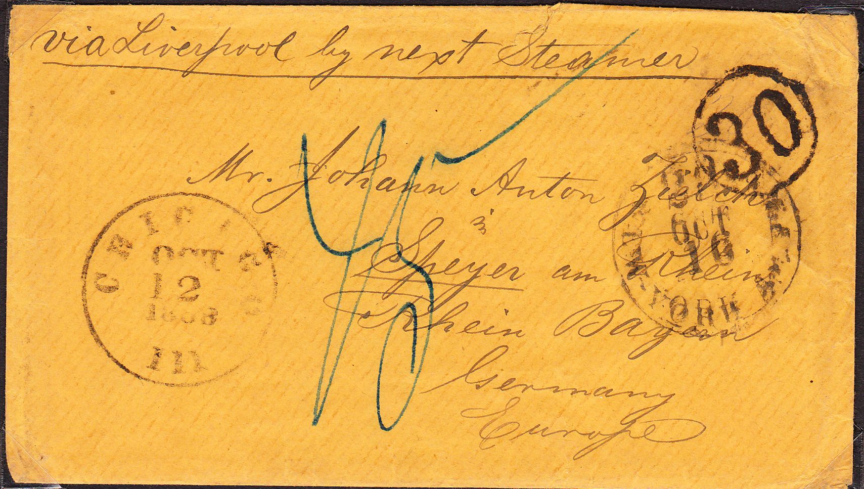 Der 2. Brief aus Chicago vom 12.10.1858 lief im Gegensatz dazu unfrankiert ab und erreichte am 16.10. New York. Das Gesamtporto wurde mit 30 Cents gestempelt, die den von Aachen später notierten 45 Kreuzern entsprachen.