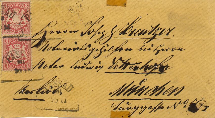 Schön, dass man neben das "f" für Franko "7 X re" für 7 Kreuzer recommandirt notierte, wie es die Vorschrift vorgab (damit man im Ausland sehen konnte, dass nicht 3 Kr. Franko und 7 Kr. Chargégebühr bezahlt worden waren (= wäre unterfrankiert!), sondern 10 Kr. Franko und