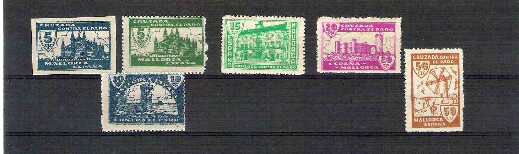 Die mallorquinischen Marken Cruzada contra el paro (= Kreuzzug gegen die Arbeitslosigkeit) stammen aus zwei verschiedenen Serien und haben alle zusammen etwa einen Wert von ca. 5 Euro; nur die Werte zu 5 und 10 céntimos wurden postalisch verwendet - alle anderen Werte dienten fiskalischen Zwecken.